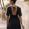 Sa coupe patineuse fluide sublime la silhouette avec légèreté, tandis que son dos nu délicatement dévoilé apporte une touche sensuelle maîtrisée.